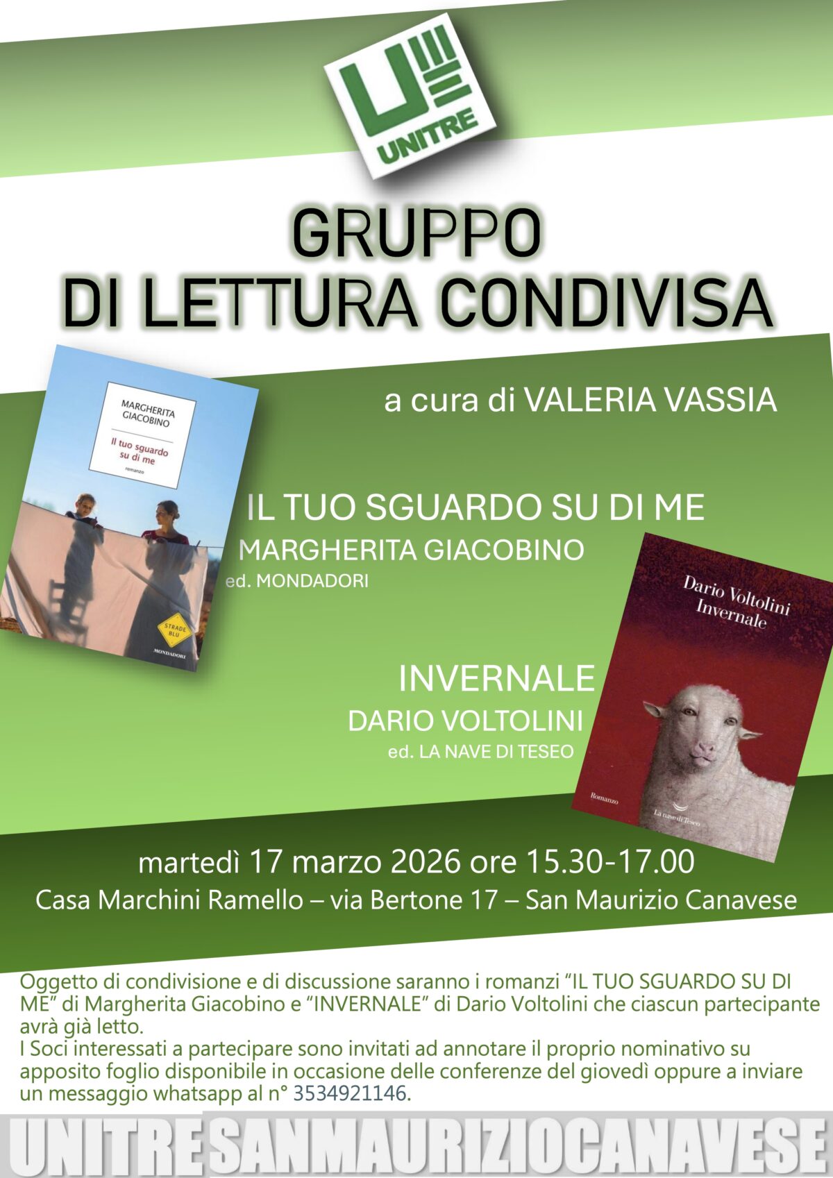 Ed eccoci al terzo incontro del Laboratorio di Lettura Condivisa, condotto da Valeria Vassia, che si terrà martedì 17/03/2026 alle ore 15:30, presso la nostra sede a Casa Marchini Ramello in via Bertone, 17 a San Maurizio Canavese.