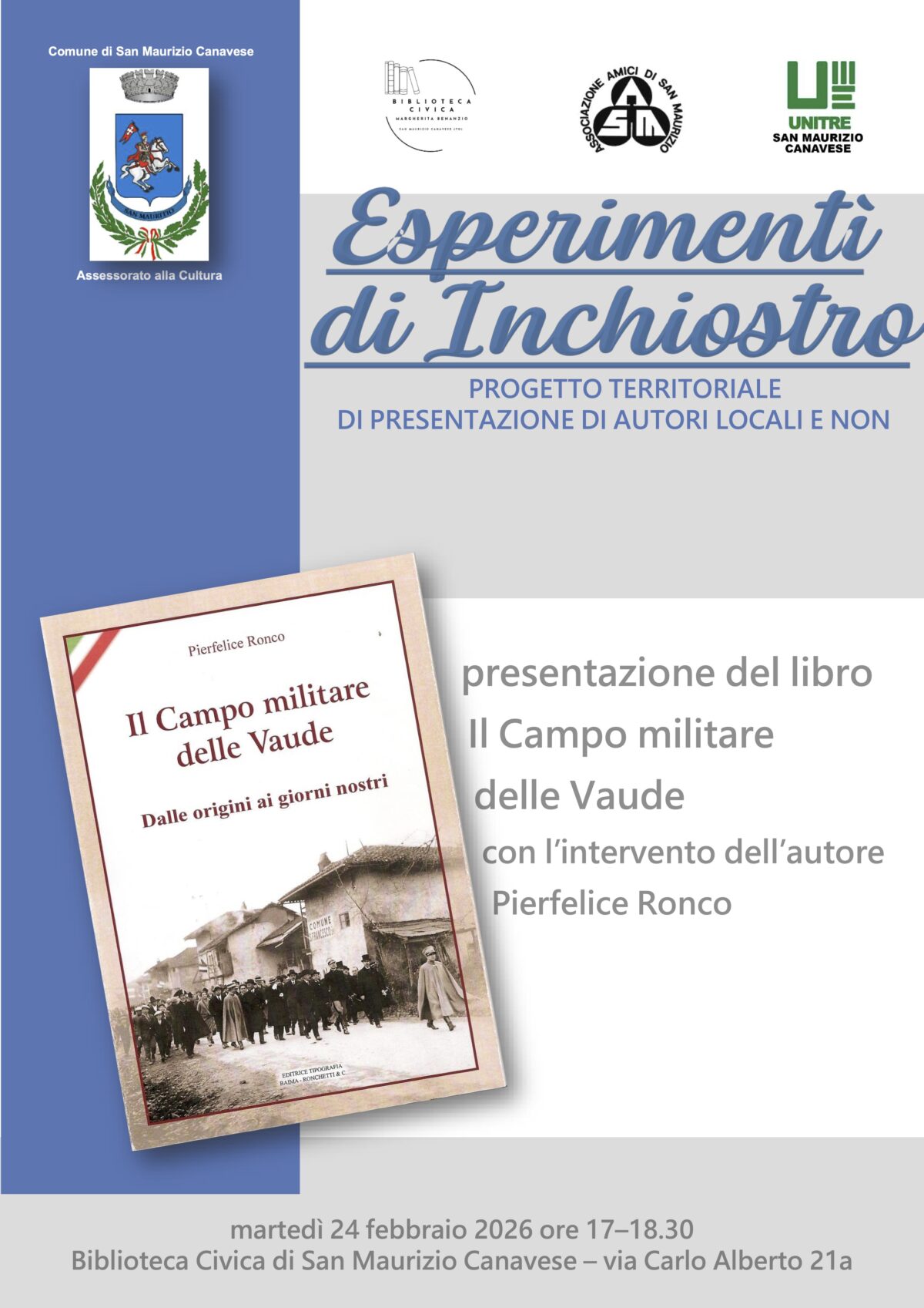 Martedì 24/02/26 alle ore 17:00, presso la Biblioteca Civica “Margherita Benanzio” -Via Carlo Alberto 21/a San Maurizio Canavese, si terrà la Presentazione del libro “Il campo militare delle Vaude” con l’autore Pierfelice Ronco nell’ambito del progetto “Esperimenti d’Inchiostro”.