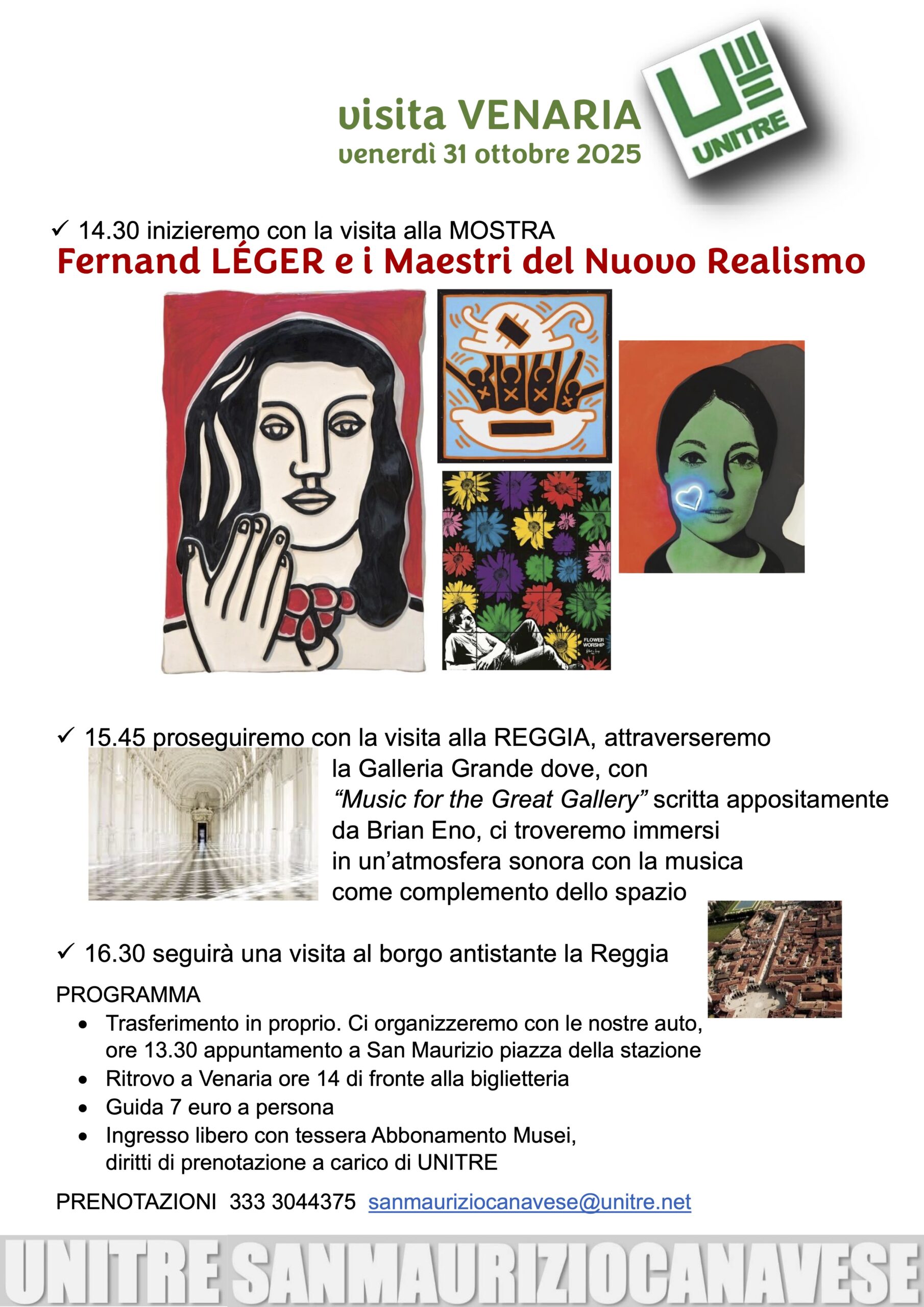 Fernand LÉGER e i Maestri del Nuovo Realismo - 15.45 proseguiremo con la visita alla REGGIA, attraverseremo la Galleria Grande dove, con “Music for the Great Gallery” scritta appositamente da Brian Eno, ci troveremo immersi in un’atmosfera sonora con la musicacome complemento dello spazio